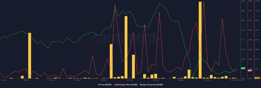 Selain itu, metrik Age Consumed untuk SAND menunjukkan bahwa pada 10 November, ada lebih dari 11 miliar token yang berpindah. Akibatnya, aktivitas tersebut turut berkontribusi dalam momentum penurunan harga tokennya sendiri.