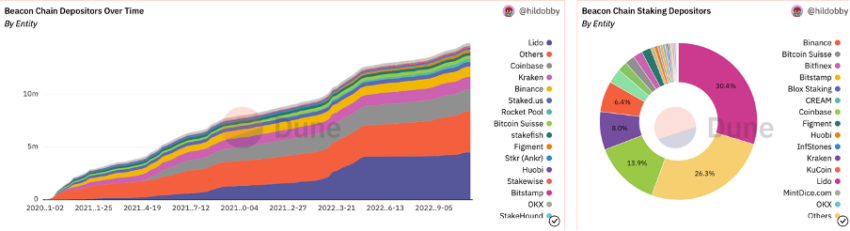 Terkait hal ini, Dune Analytics menguak fakta bahwa Lido ternyata adalah pemegang stake ETH terbesar, yaitu dengan jumlah kepemilikan sebesar 4.529.312 ETH yang mereka letakkan dalam staking, atau sebesar 30,4% dari total pool-nya. Sementara itu, Coinbase (13,89%) dan Kraken (7,99%) masing-masing menempati posisi ke-2 dan ke-3.