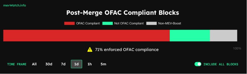 Saat ini, 71% block Ethereum sudah beroperasi sesuai dengan regulasi OFAC. Jumlah ini telah meningkat signifikan dibandingkan jumlahnya pada akhir September yang hanya mencapai 25%.