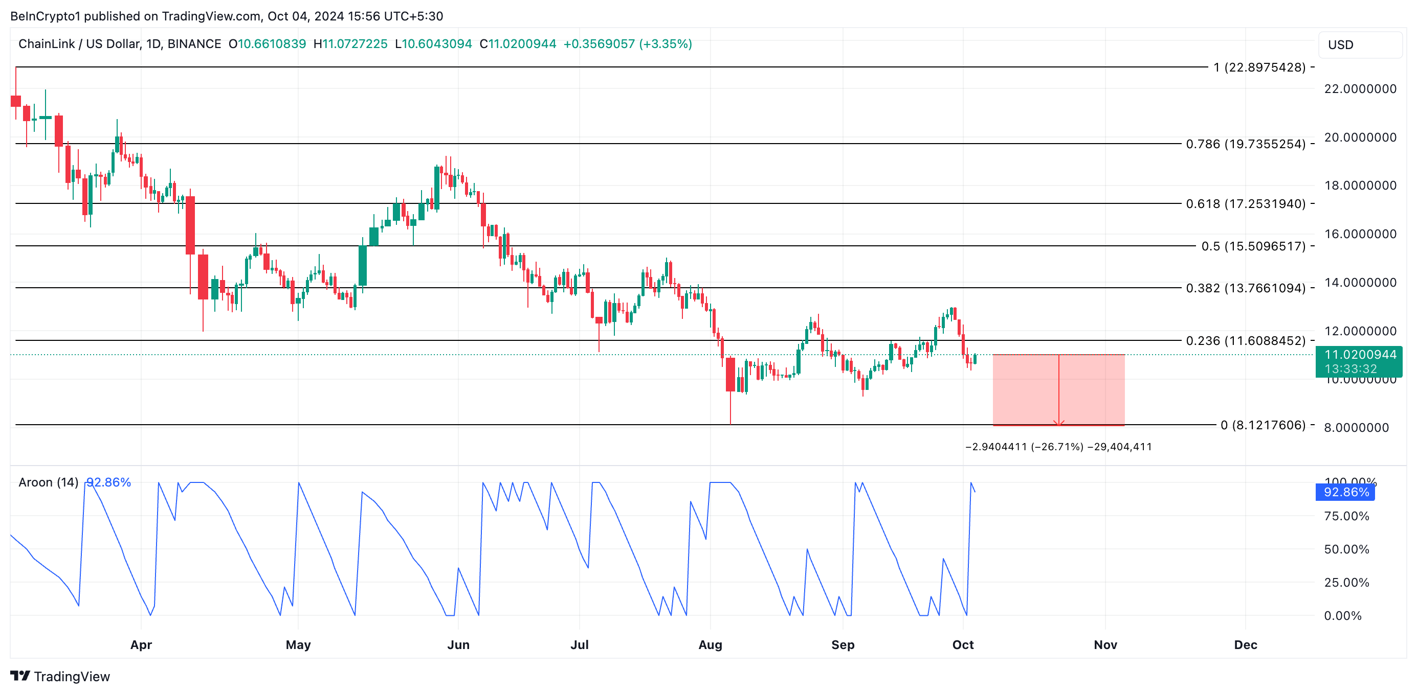 Pembacaan mendekati 100% menunjukkan bahwa harga secara konsisten mencatatkan puncak yang lebih rendah, menandakan tren menurun yang kuat. Jika tren ini berlanjut, harga Chainlink bisa turun lagi 27%, berpotensi kembali ke titik terendahnya pada 5 Agustus sebesar US$8,12.