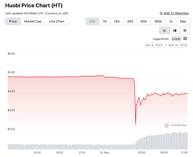 Pada hari Jumat (10/3) pukul 03:50 WIB, harga token HT masih berada di level US$4,7. Namun, pada pukul 04:10 WIB, harganya ambruk ke level US$1,8 per token. Artinya, harga token HT jatuh sebanyak 61% dalam periode itu.