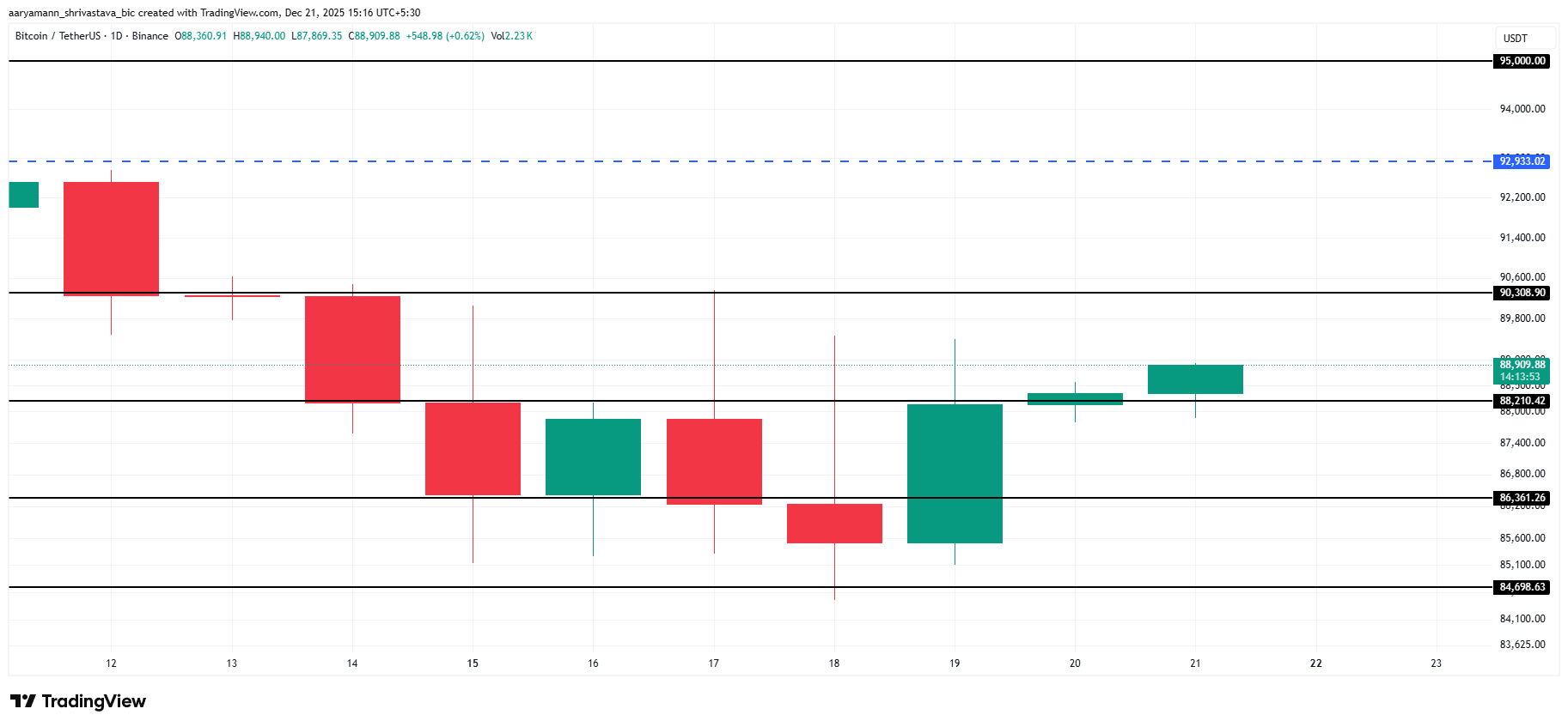 Jika momentum bullish melemah, Bitcoin berisiko turun di bawah US$88.210. Jika support ini jebol, US$86.361 menjadi target penurunan berikutnya. Kehilangan kedua level ini dapat memperpanjang tekanan bearish.