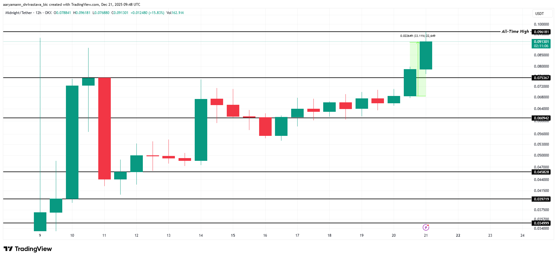 NIGHT melonjak 33% dalam 24 jam terakhir, dan saat ini diperdagangkan di kisaran US$0,091 pada waktu publikasi. Reli ini mencetak all-time high intraday di US$0,0196. Momentum kuat ini menunjukkan permintaan tinggi dan eksposur besar karena trader merespon pergerakan harga yang pesat.
