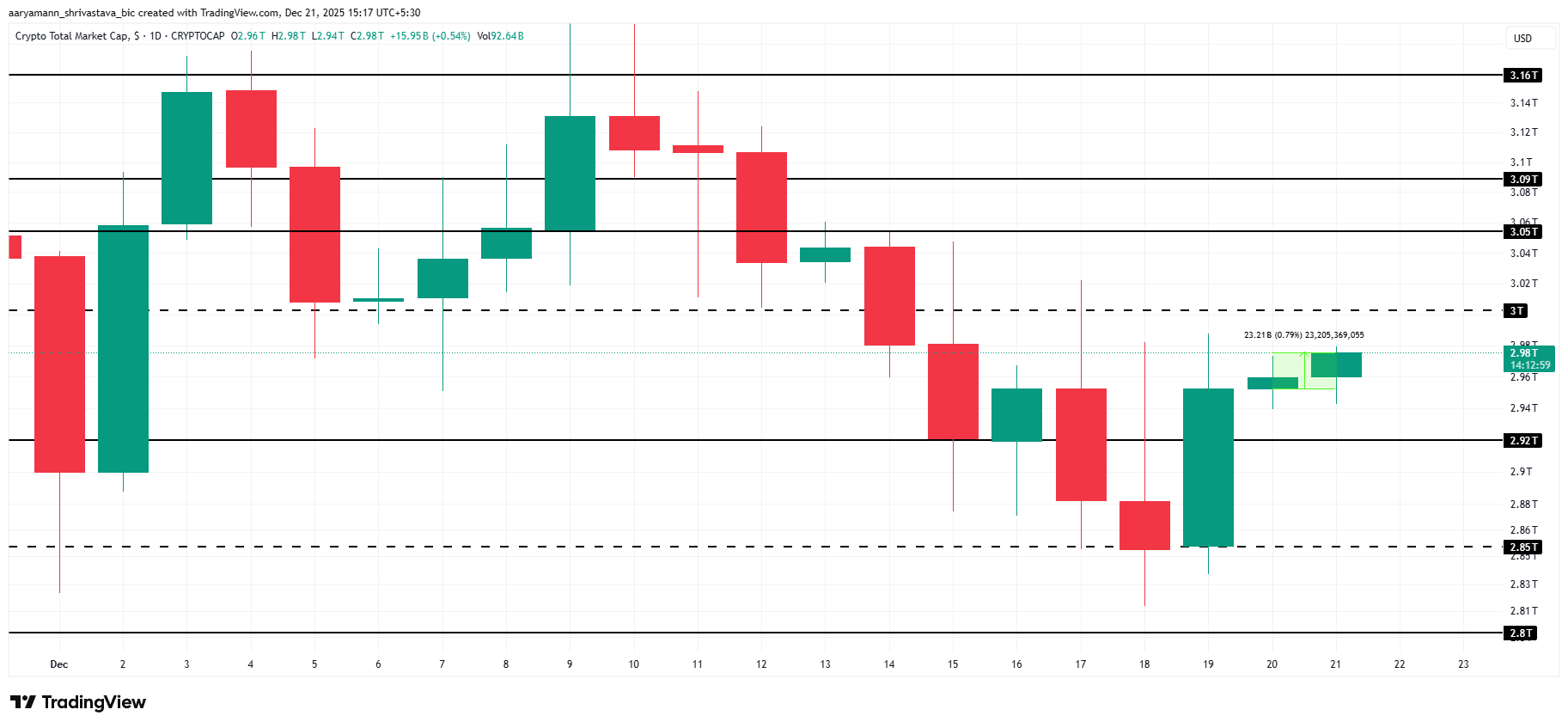 Total market cap aset kripto saat ini mencapai US$2,98 triliun, naik US$23 miliar dalam 24 jam terakhir. Upaya pemulihan ini menunjukkan adanya stabilisasi jangka pendek. Jika tekanan beli terus bertahan, Bitcoin bisa memperoleh kenaikan ringan beberapa hari ke depan.