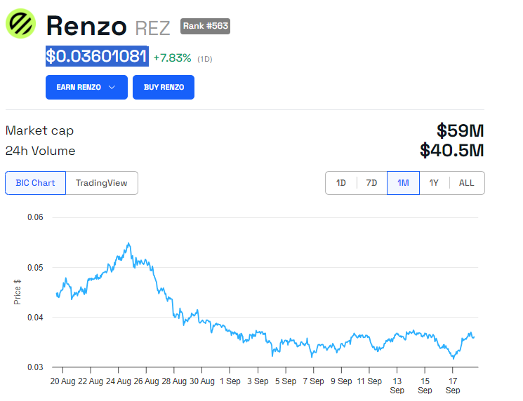 Dengan dukungan Binance Labs, Protokol Renzo, REZ berada dalam posisi yang baik untuk bereaksi terhadap pembebasan CZ akhir bulan ini. Saat ini, Renzo diperdagangkan pada US$0,0360, naik hampir 8% sejak sesi Rabu dibuka.