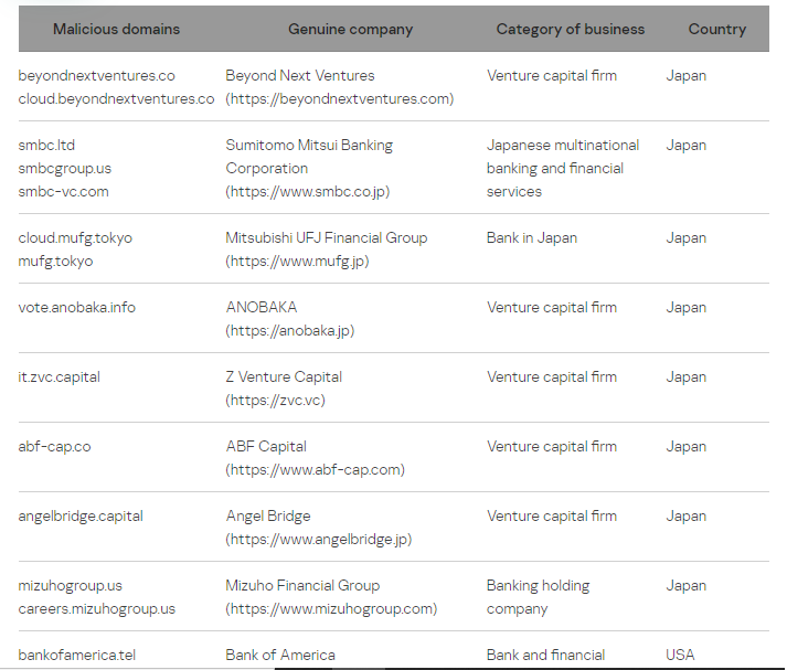 Menariknya, kebanyakan dari domain tersebut meniru perusahaan keuangan asal Jepang. Kaspersky menuturkan bahwa hal tersebut membuktikan bahwa organisasi kejahatan tersebut memiliki minat tersendiri terhadap pasar Jepang.
