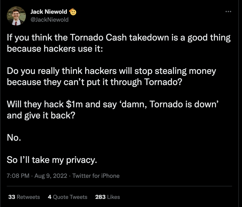 Komunitas kripto percaya bahwa Tornado Cash adalah sebuah infrastruktur publik sumber terbuka (open-source) yang memiliki manfaat besar. Hanya saja, para penjahat telah menyalahgunakannya untuk melangsungkan aksi kejahatan.