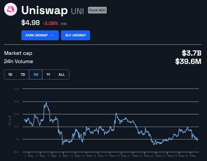 Tapi sayangnya, prospek token tata kelola platform Uniswap sendiri, yakni UNI, memang tidak begitu cemerlang. Pasalnya, harga UNI terpantau sudah turun 3% pada hari itu, kembali jatuh di bawah level US$5.