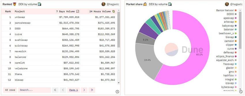 Dune Analytics mengonfirmasi data ini dan melaporkan bahwa Uniswap memegang pangsa pasar sebesar 60% dalam volume perdagangan selama 7 hari. Selanjutnya, menurut Dune, DEX ini juga telah memproses volume sebesar US$7,8 miliar selama seminggu terakhir.
