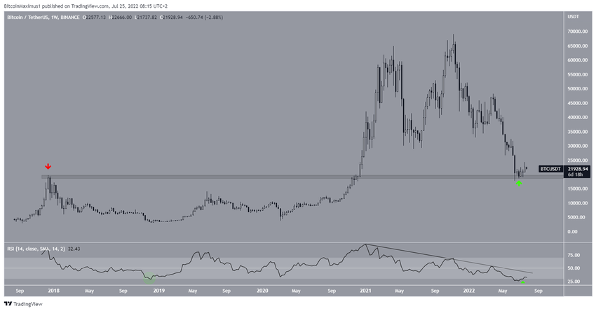 Selain itu, harga Bitcoin juga telah memantul di area support horizontal US$19.250 (panah hijau), yaitu level yang juga bertindak sebagai titik resisten harga tertinggi atau ATH pada tahun 2017 (panah merah).