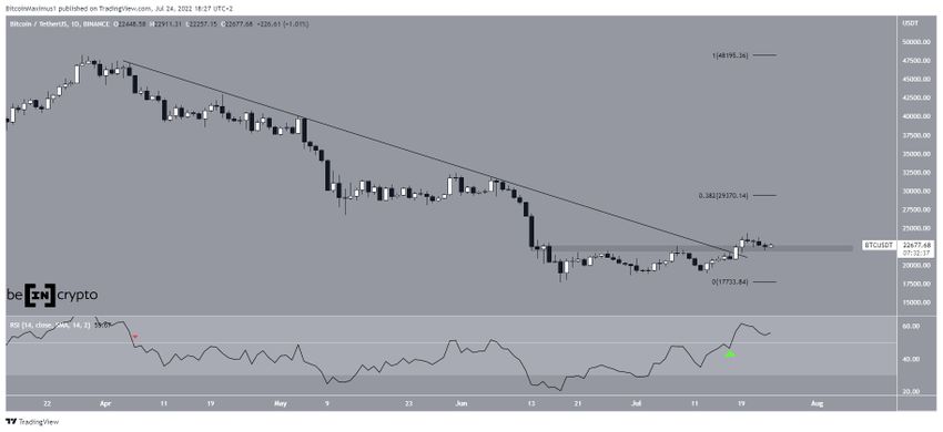 Kedua, Bitcoin juga telah bergerak di atas area horizontal US$22.300, dan memvalidasinya sebagai titik support. Sehingga, harganya telah berhasil menjebol level resisten diagonal dan juga horizontal.