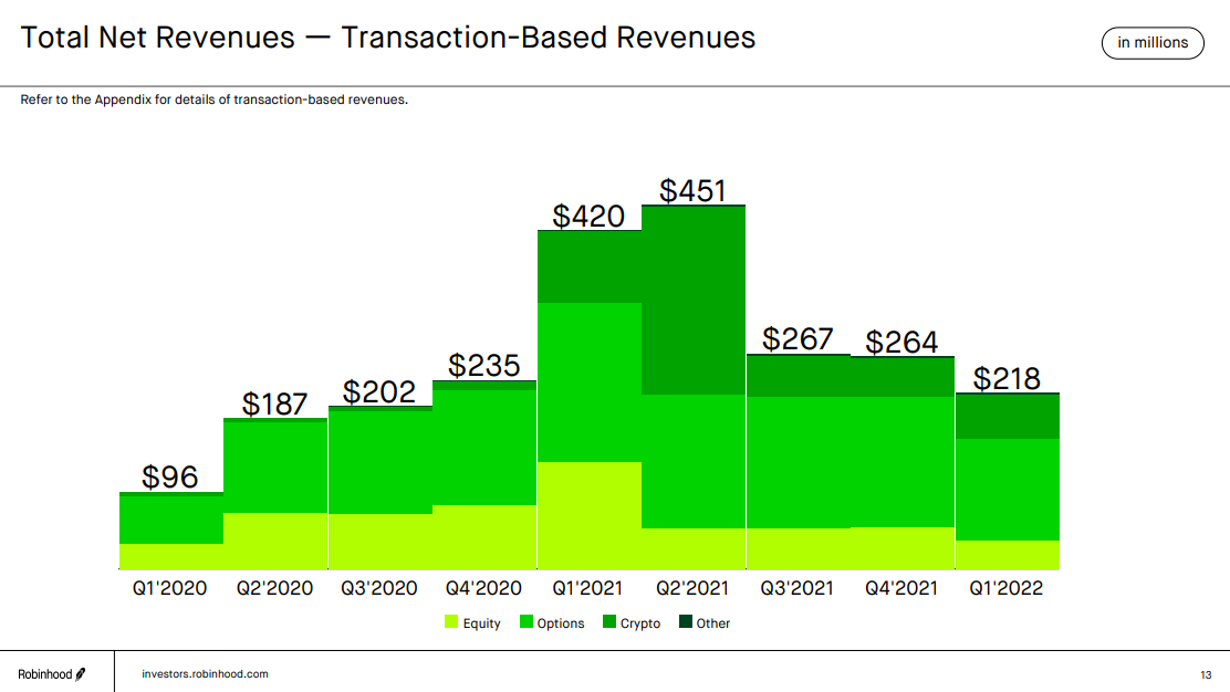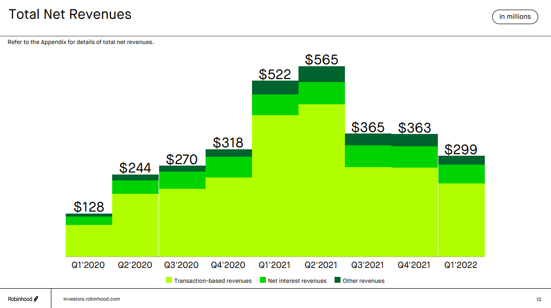 Transaction-based revenues menyumbang 72,91% bagi total pendapatan bersih Robinhood pada kuartal pertama tahun 2022, sementara net interest revenues berkontribusi 18,39% dan other revenues 8,7%.