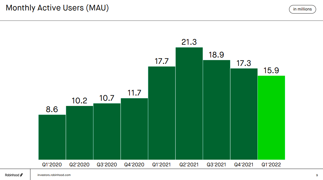 Sayangnya, pengguna Robinhood turun 10% menjadi 15,9 juta monthly active users (MAU) pada akhir Maret 2022, dibandingkan dengan 17,7 juta MAU pada Maret 2021.