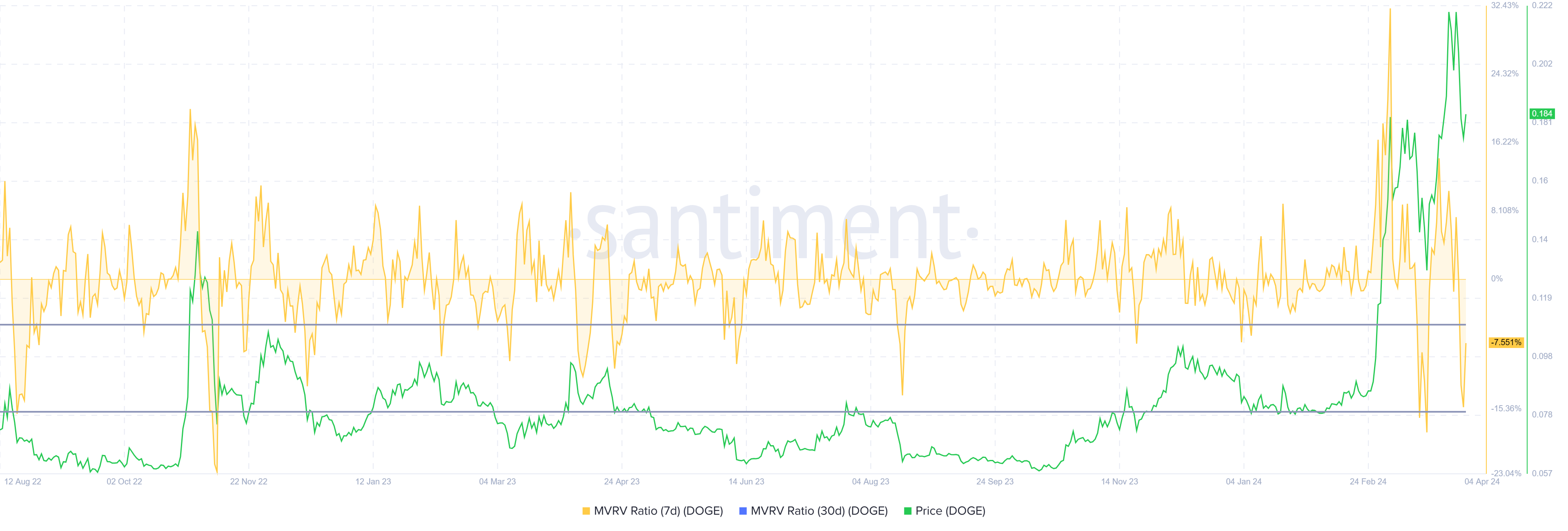 Saat ini, rasio MVRV 7 hari Dogecoin adalah -7,55%, yang menunjukkan bahwa banyak holder berada di zona rugi—suatu kondisi yang secara historis menjadi pendahulu fase pemulihan. Biasanya, pemulihan untuk DOGE terjadi ketika rasio MVRV berada di kisaran -5% hingga -15%, menandainya sebagai zona peluang bagi investor.