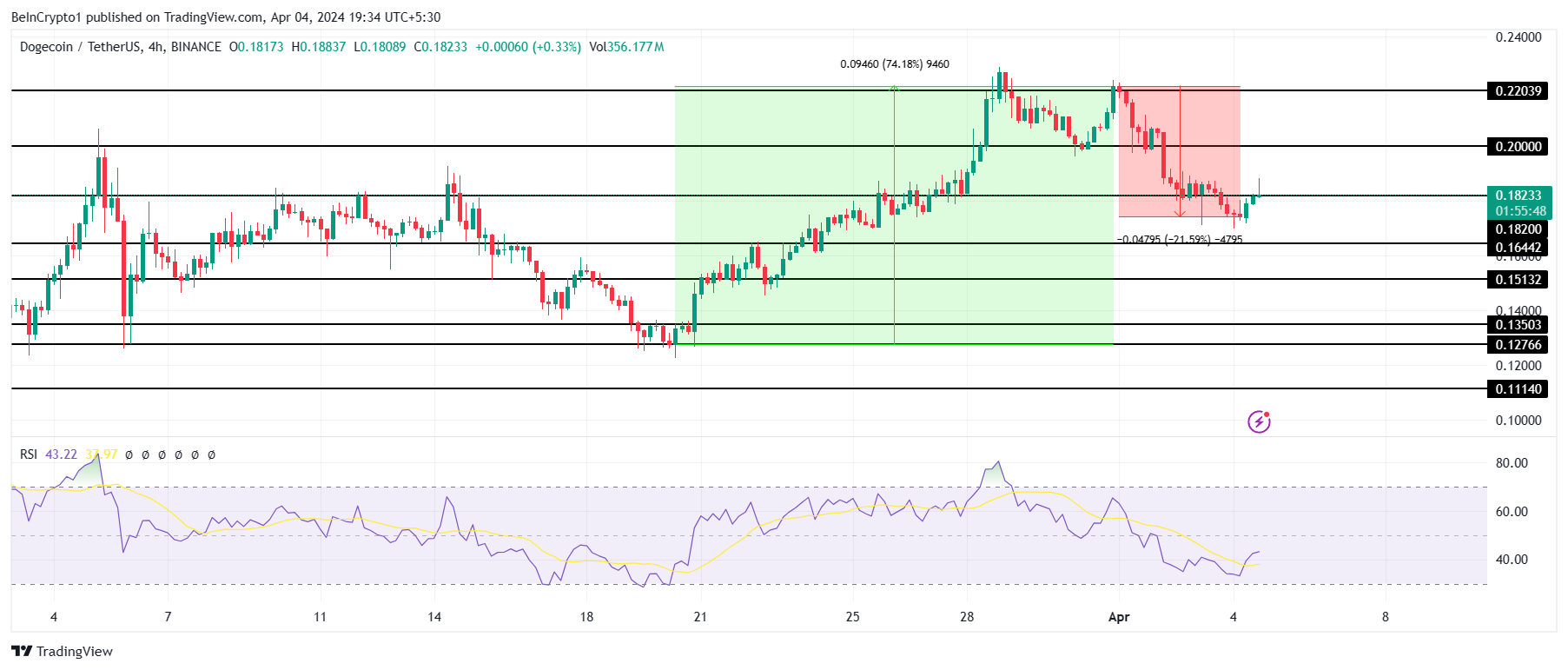 Harga perdagangan Dogecoin sekarang adalah US$0,182, hampir melampaui level support penting di US$0,182. Keberhasilan untuk mengubah level ini menjadi titik support dapat menjadi katalis untuk reli DOGE menuju US$0,200.