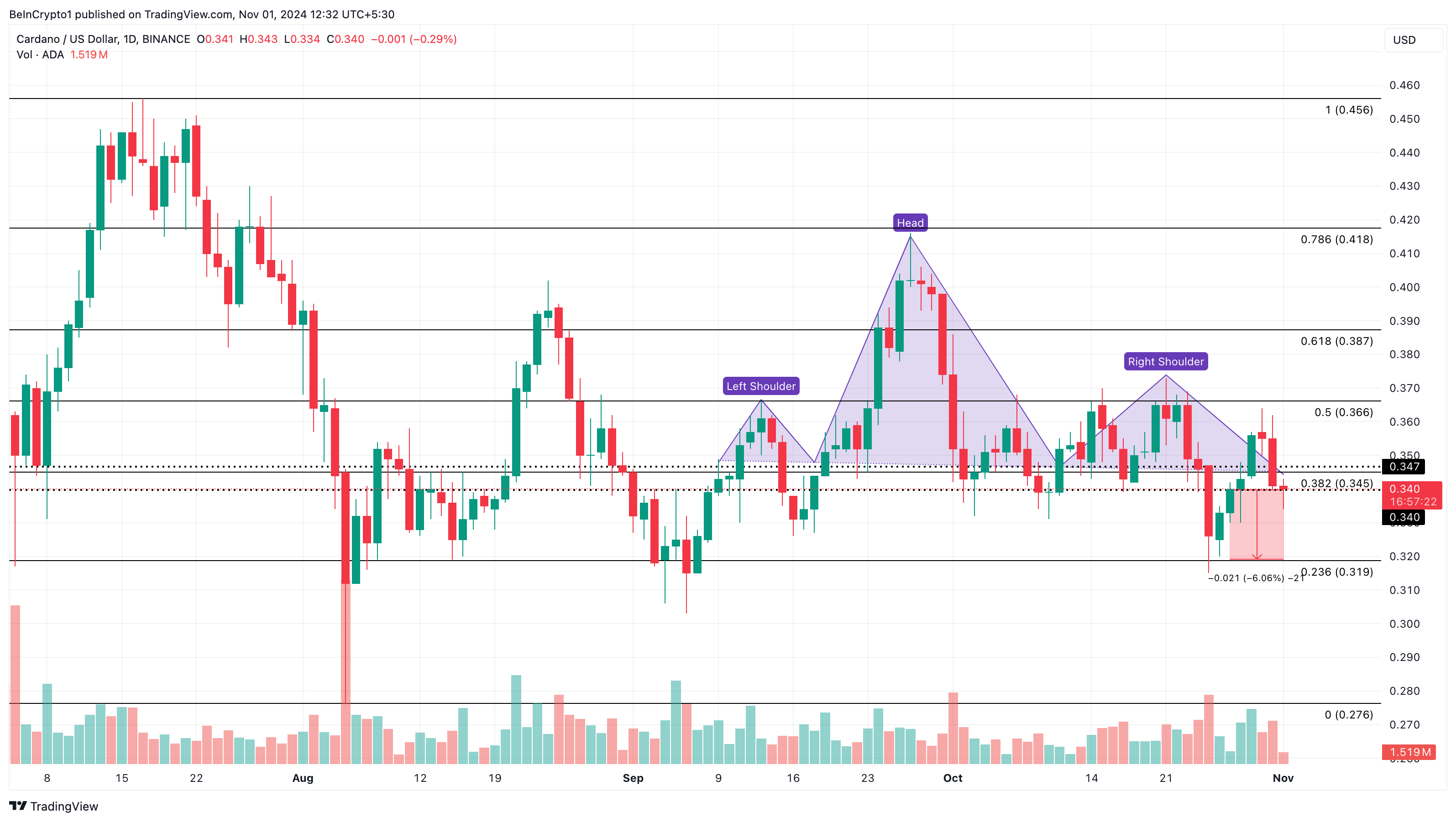 Konfirmasi pola bearish terjadi ketika kripto yang terlibat menembus di bawah garis leher. Seperti yang terlihat di bawah ini, garis leher dari pola tersebut adalah sekitar US$0,34, dan ADA telah turun di bawah wilayah tersebut. Jika ini tetap sama, maka harga ADA mungkin turun lagi 6%, mungkin turun menjadi US$0,32.