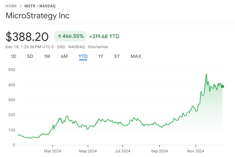 Siklus bullish Bitcoin tahun ini tecermin pada performa MicroStrategy di pasar saham. Harga saham MSTR menguat lebih dari 460% secara year-to-date (YTD).