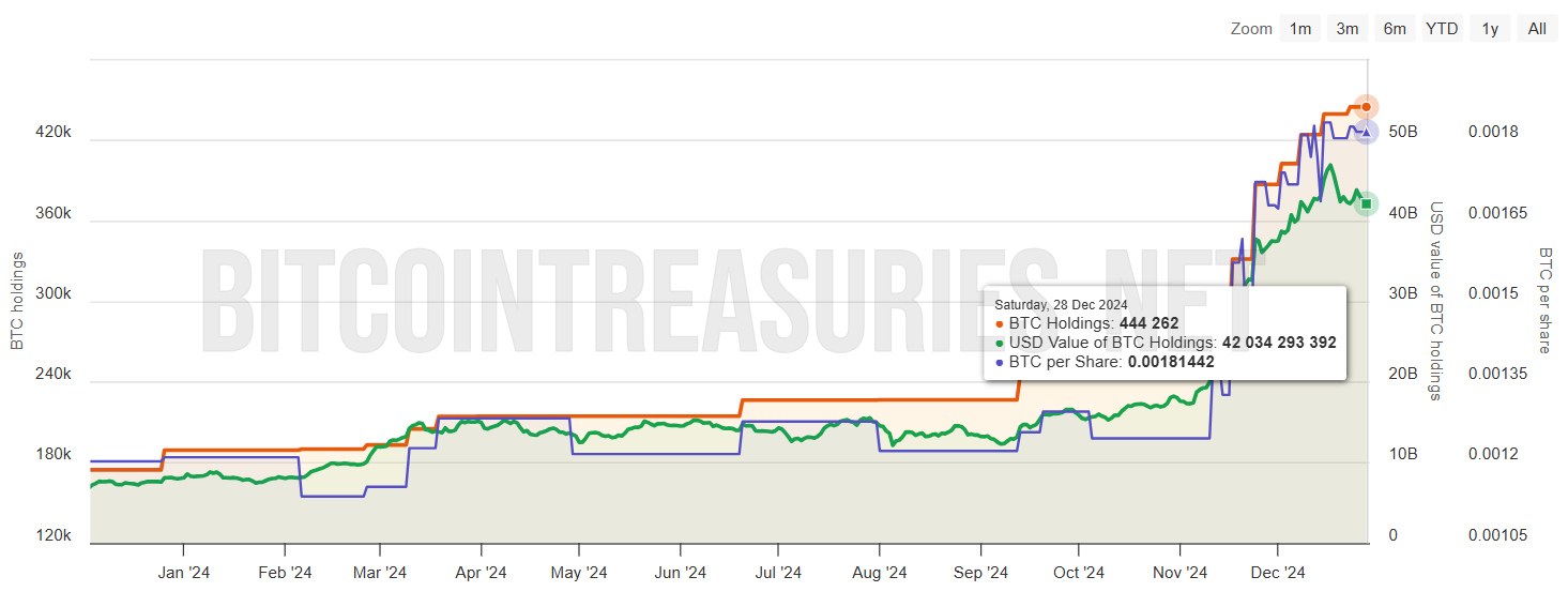 MicroStrategy telah melakukan pembelian Bitcoin secara agresif, mengakumulasi lebih dari 192.042 BTC dengan biaya diperkirakan mencapai US$18 miliar. Selama periode ini, harga Bitcoin melejit dari US$67.000 menjadi US$108.000. Sementara, harga saham MicroStrategy naik lebih dari lima kali lipat tahun ini saja, saat ini diperdagangkan sekitar US$360 — melonjak 400% menurut metrik year-to-date.