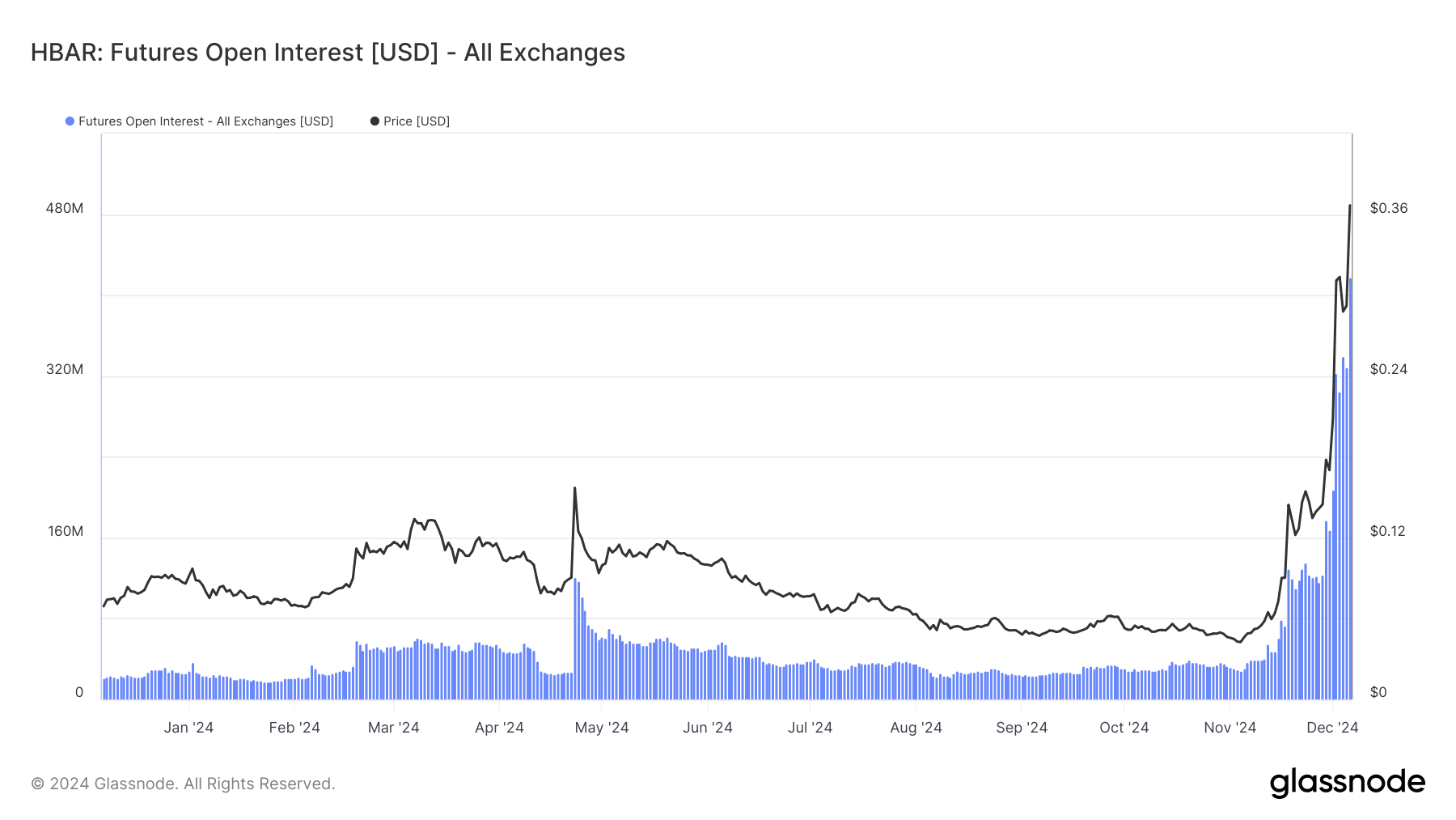 Beberapa hari yang lalu, BeInCrypto melaporkan bagaimana open interest HBAR melonjak ke US$220 juta. Namun, pada waktu publikasi, indikator yang sama, menurut Glassnode, telah naik menjadi US$417,98 juta. OI, sebutan akrabnya, mewakili jumlah total posisi terbuka dalam sebuah kontrak, dengan setiap posisi memiliki pembeli dan penjual yang setara.