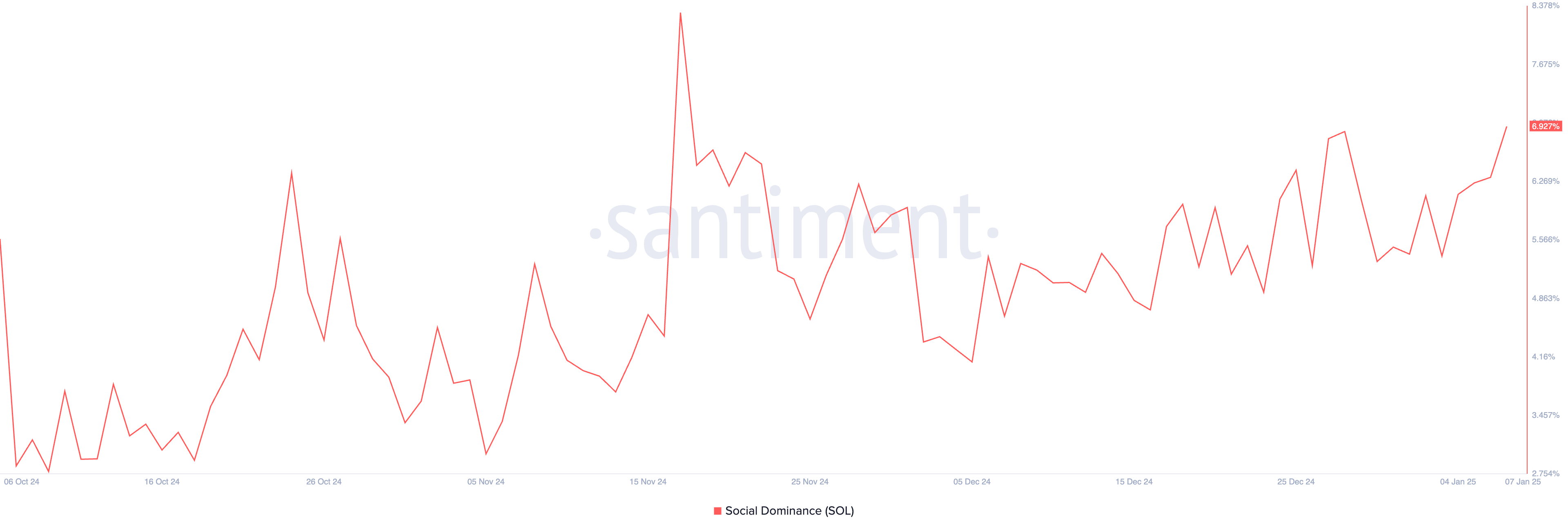 Lonjakan terbaru dalam open interest Solana sejalan dengan peningkatan dominasi sosialnya, yang kini mencapai puncak dua bulan di 6,92%, menurut Santiment.