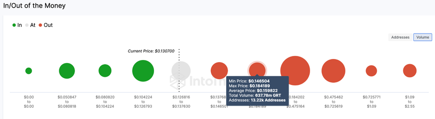 Namun, data Global In/Out of The Money Around Price (GIOM) dari IntoTheBlock menunjukkan bahwa GRT sebelum itu akan menghadapi resistance besar di sekitar level US$0,15.