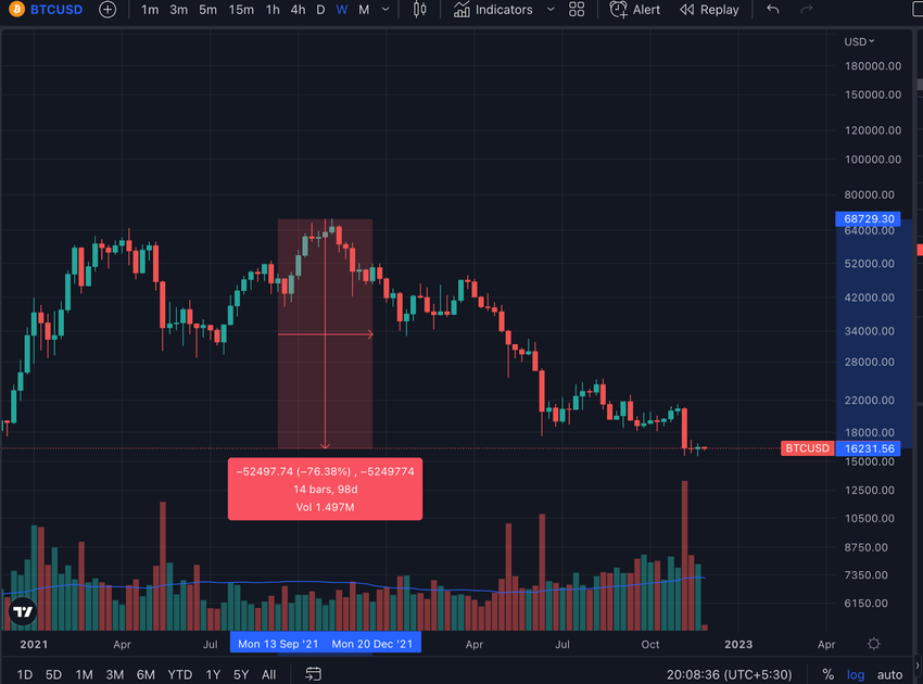 Setelah mencetak titik tertingginya sepanjang masa (ATH) baru di harga US$69.000 pada November 2021, Bitcoin (BTC) terus mengalami tren turun selama setahun terakhir ini. Terlebih lagi, keruntuhan FTX baru-baru ini telah mengirimkan harga Bitcoin ke level terendahnya yang baru, yakni di bawah level US$16.000. Dengan kata lain, BTC telah anjlok lebih dari 75% terhitung dari level ATH-nya.