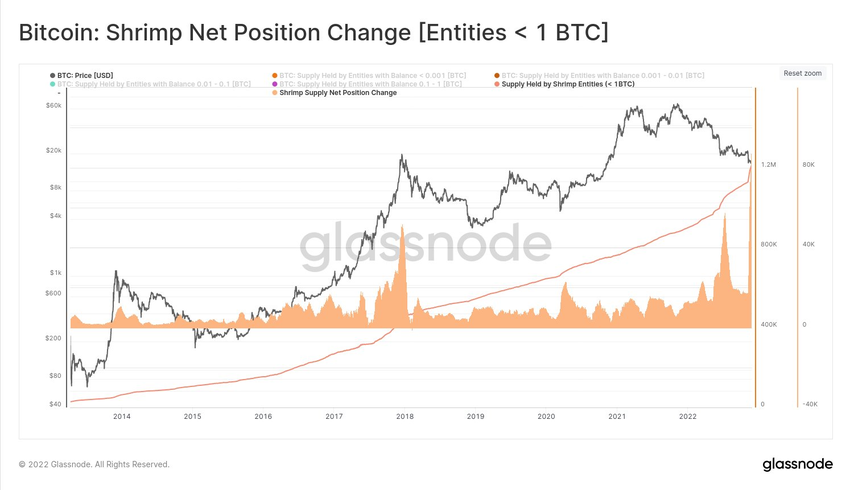 Menurut utas Twitter Glassnode, shrimp Bitcoin telah menimbun sebanyak 96.200 BTC sejak FTX bangkrut. Jumlah Bitcoin yang dipegang oleh para shrimp tersebut telah mencapai titik ATH.