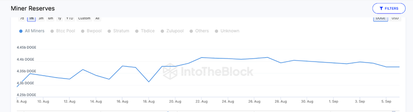 Walaupun harga DOGE turun 15% sejak 8 Agustus, ternyata para miner Dogecoin diam-diam telah meningkatkan cadangan mereka. Menurut data dari IntoTheBlock, pada 8 Agustus, para miner DOGE awalnya hanya memiliki 4,29 miliar koin dalam cadangan kumulatif mereka. Namun, sebulan kemudian, saldo mereka saat ini sudah mencapai 4,38 miliar DOGE.