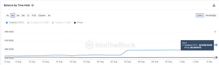 Pada 8 Agustus, hanya 45,37 miliar DOGE yang tersimpan di alamat wallet jangka panjang. Namun, per tanggal 7 September, angka tersebut secara bertahap telah meningkat menjadi 46,63 miliar. Tambahan 1,26 miliar DOGE ke kepemilikan mereka selama sebulan terakhir menunjukkan bahwa investor jangka panjang Dogecoin sekarang menguasai 32,50% dari total pasokan yang beredar.