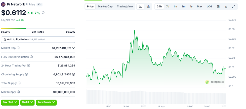 Pi coin membalikkan keuntungan dalam beberapa hari, jatuh 18% dari puncak mingguan. Pada waktu publikasi, PI diperdagangkan pada US$0,6112, naik sebesar 0,7% dalam 24 jam terakhir, menurut CoinGecko.