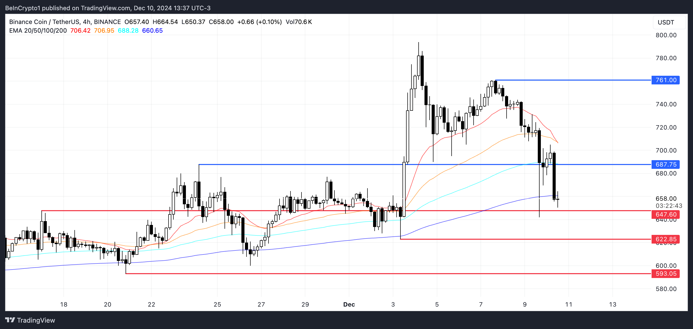 Jika tren penurunan saat ini berlanjut dan level support US$647 gagal bertahan, harga BNB mungkin melihat penurunan yang lebih signifikan, berpotensi menguji US$622 dan bahkan US$593. Level-level ini mewakili zona support kunci yang akan menjadi krusial untuk menentukan kekuatan tren penurunan dan kemungkinan kerugian lebih lanjut.