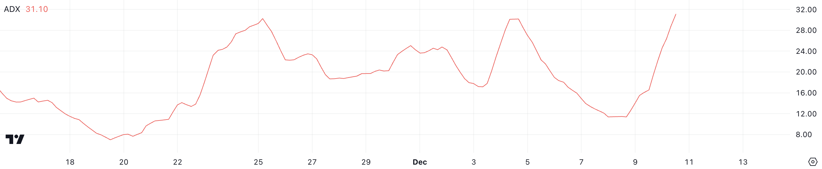 ADX, atau Average Directional Index, mengukur kekuatan tren terlepas dari apakah itu bullish atau bearish. Nilai di atas 25 menunjukkan tren yang kuat, sementara nilai di bawah 20 menunjukkan tren yang lemah atau tidak terdefinisi.