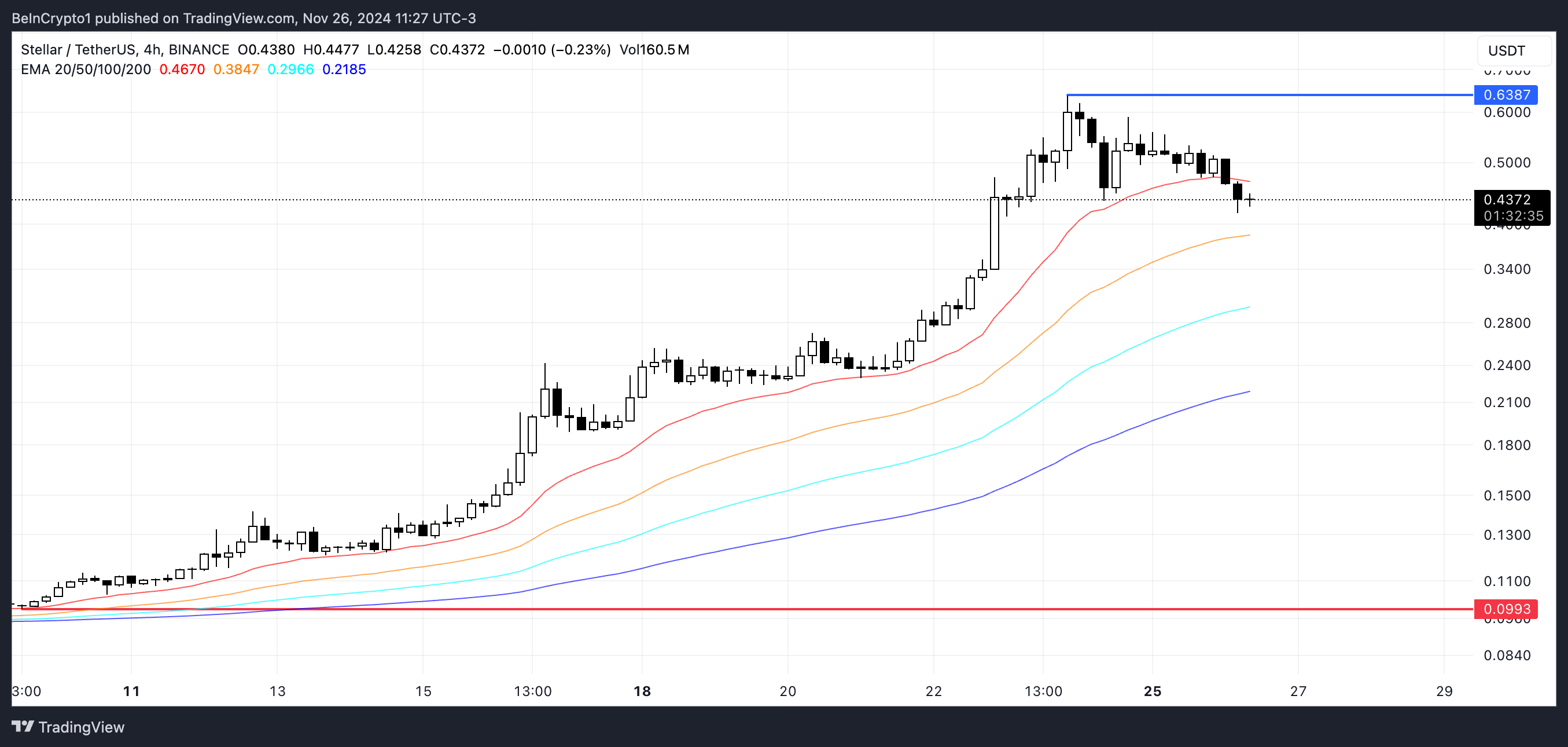 Garis EMA Stellar tetap bullish, dengan garis jangka pendek di atas garis jangka panjang, menunjukkan tren naik secara keseluruhan. Namun, celah yang menyempit antara garis-garis ini menunjukkan momentum bullish yang melemah dan potensi perubahan sentimen.