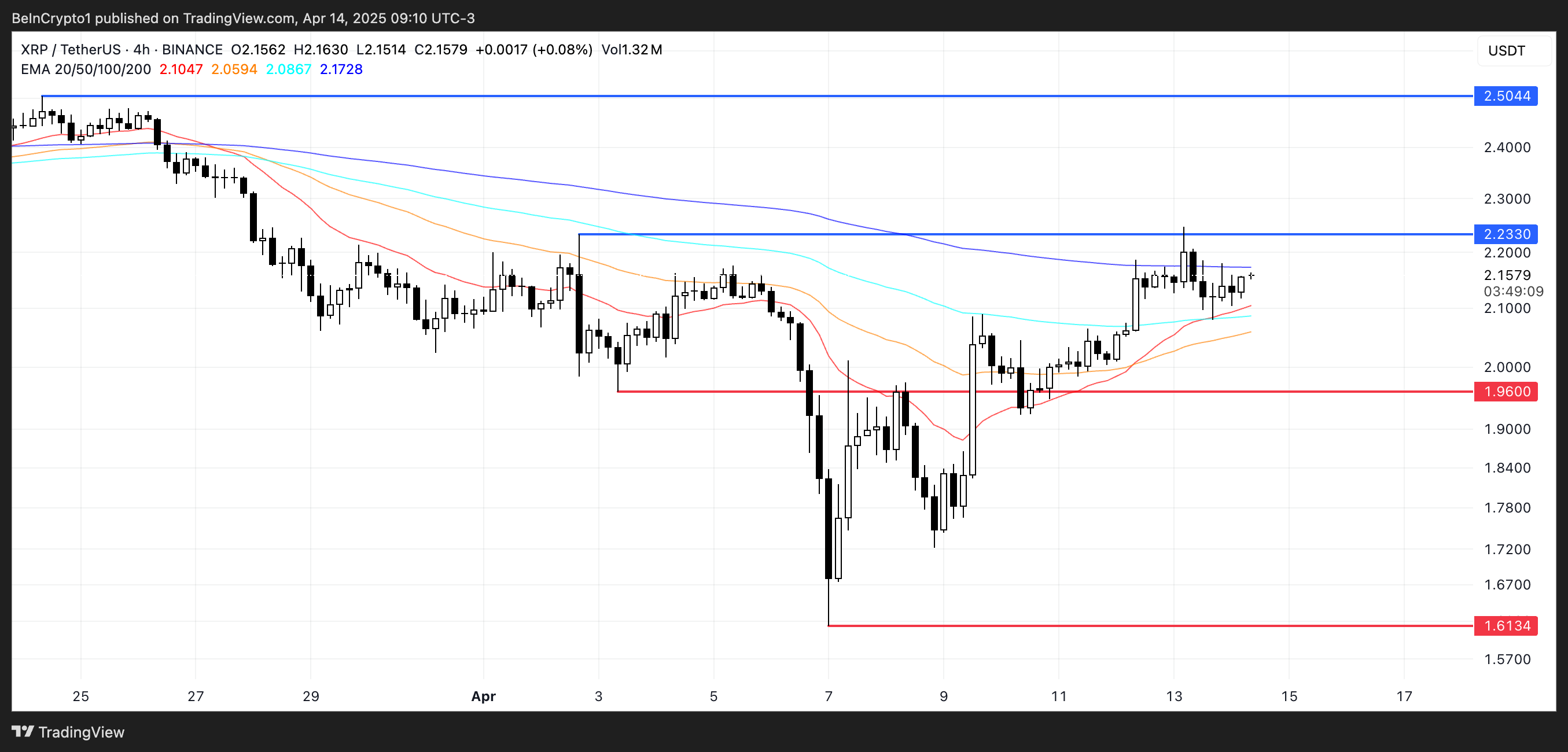 Garis EMA XRP tengah menyempit, mengisyaratkan potensi terbentuknya pola golden cross—sebuah sinyal bullish yang muncul saat EMA jangka pendek melintasi EMA jangka panjang dari bawah.