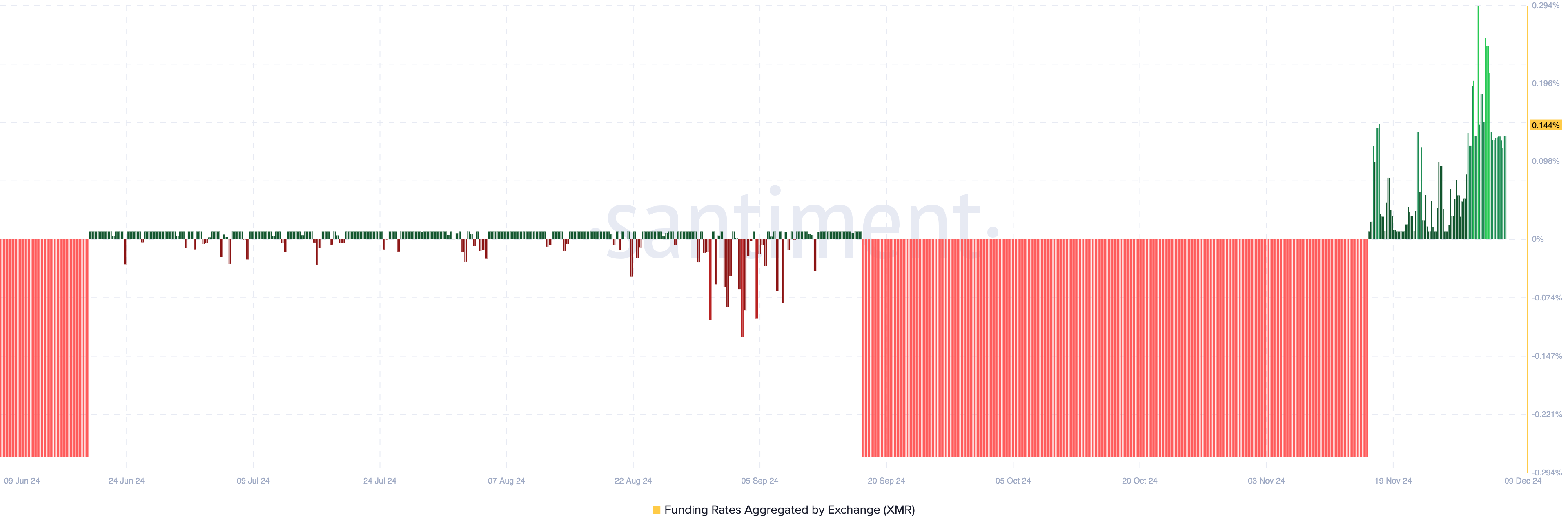 Berdasarkan data Santiment, funding rate Monero adalah 0,14%, menunjukkan bahwa sebagian besar posisi condong ke sisi bullish. Jika ini tetap sama, maka harga XMR kemungkinan akan naik karena meningkatnya permintaan di pasar derivatif.