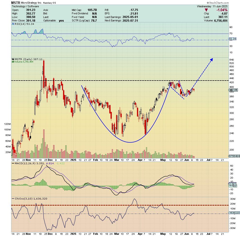 Menariknya, analis lain menunjukkan bahwa MSTR sedang membentuk pola Cup and Handle. Ini adalah pola kelanjutan bullish dalam analisis teknikal. Biasanya menandakan bahwa saham sedang bersiap untuk bergerak naik.