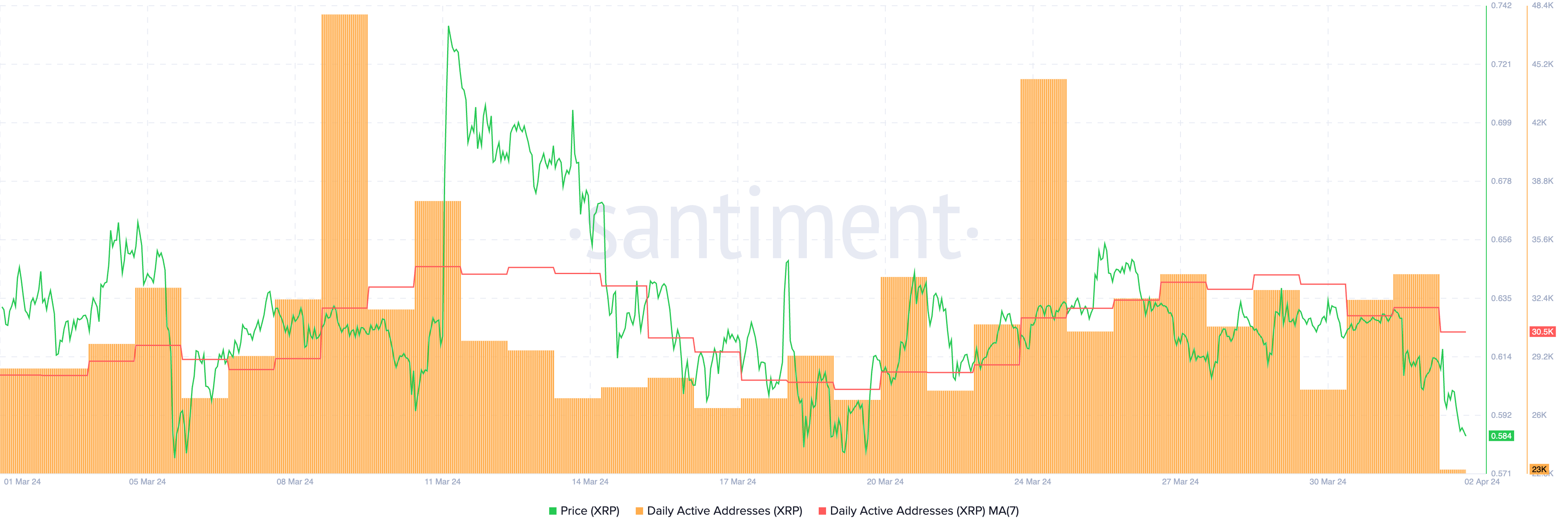 Sementara itu, periode baru-baru ini dari 29 Maret sampai 2 April telah menunjukkan kelanjutan tren tersebut, dengan moving average 7 hari dari Alamat Aktif Harian terperosok dari 33.684 menjadi 30.559, atau turun 10%. Penurunan ini mengindikasikan kian lesunya minat investor pada XRP. Hal ini sejalan dengan semakin sedikitnya alamat yang terlibat dalam transaksi di jaringan.