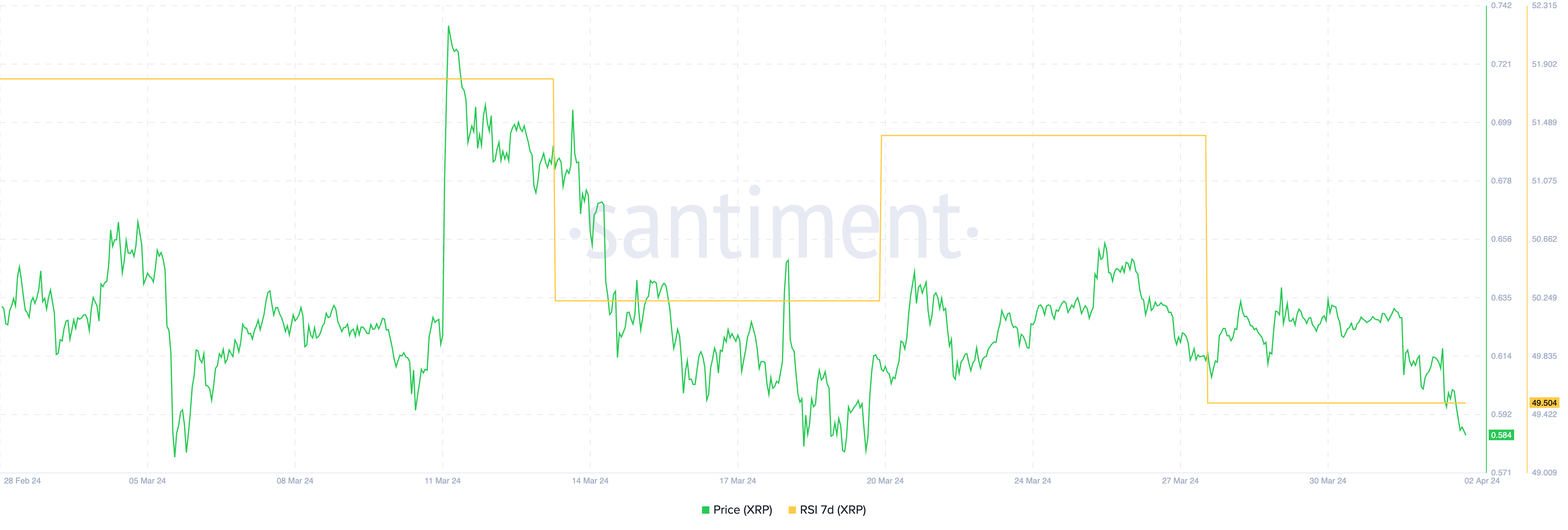 Pasar XRP menunjukkan tanda-tanda kurangnya minat investor. Sementara itu, Relative Strength Index (RSI) 7 hari berada di angka 49,5. Spesifiknya, angka ini berada di dekat bagian tengah spektrum RSI. Ini menunjukkan sentimen yang lesu terhadap XRP tanpa momentum beli maupun jual yang kuat.