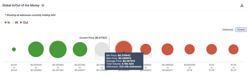 Data itu menunjukkan bahwa para bull harus terlebih dahulu menaklukkan resistance awal di area US$0,39. Seperti yang tergambar di bawah ini, sebanyak 222.430 alamat telah membeli 5,78 miliar ADA dengan harga rata-rata US$0,39. Namun, jika para investor tersebut tetap HODL dengan kuat, mereka dapat memicu breakout harga ADA secara instan di atas US$0,40 seperti yang diprediksi.