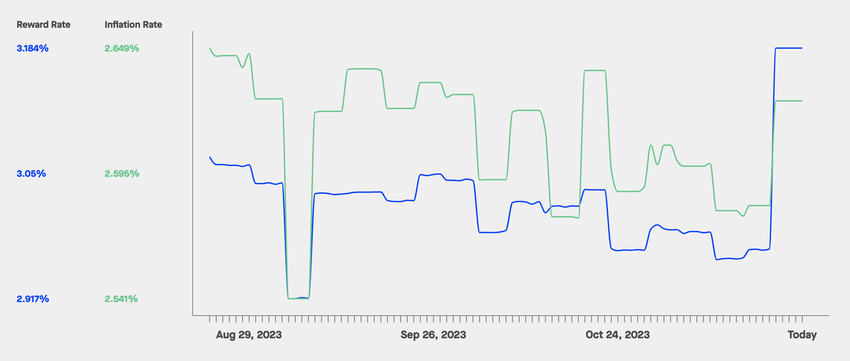 Grafik di bawah ini menunjukkan bahwa tingkat reward atau Reward Rate ADA meningkat dari 2,97% menjadi 3,18% pada 17 November kemarin, melampaui tingkat inflasi yang hanya sebesar 2,63%. Namun, yang terpenting, pergerakan bersejarah ini menandai pertama kalinya tingkat reward Cardano melampaui tingkat inflasinya dalam kurun 90 hari terakhir.