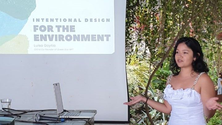 Selanjutnya, Luisa Goytia, yang merupakan co-founder Green Star NFT, membawakan topik tentang “Intentional Design for the Environment”. Dia memaparkan tentang ‘memvisualisasikan pengalaman kontraproduktif atau membingungkan’ yang diperkenalkan oleh penciptaan tanpa berpikir. Kemudian, ia menjelaskan tentang bentuk pemahaman dasar mengenai siklus produk dan layanan, serta mempelajari ‘cara mengajukan pertanyaan kritis’ mengenai konsumsi sumber daya.