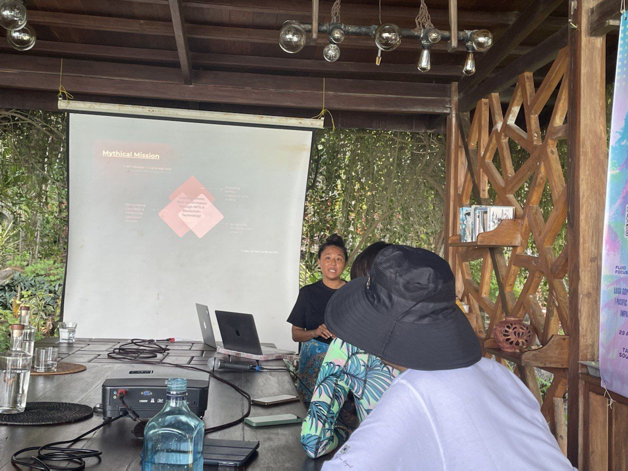 Agenda dilanjutkan dengan workshop yang dibawakan oleh Sid. Dia menguraikan berbagai hal termasuk menciptakan ekonomi komunitas (community economy), apa itu decentralized autonomous organization (DAO), token $KRIYA dalam penggunaannya pada Mythical Beings, serta menggunakan ekonomi komunitas dan DAO untuk menciptakan perubahan yang efektif.