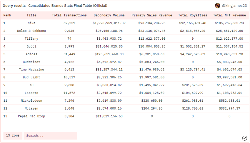 Menurut data dari Dune Analytics, Nike telah berhasil mencapai nilai penjualan NFT sebesar US$185 juta. Alhasil, prestasi ini mampu menempatkannya di urutan teratas dalam daftar brand berpenghasilan tertinggi dari penjualan NFT.
