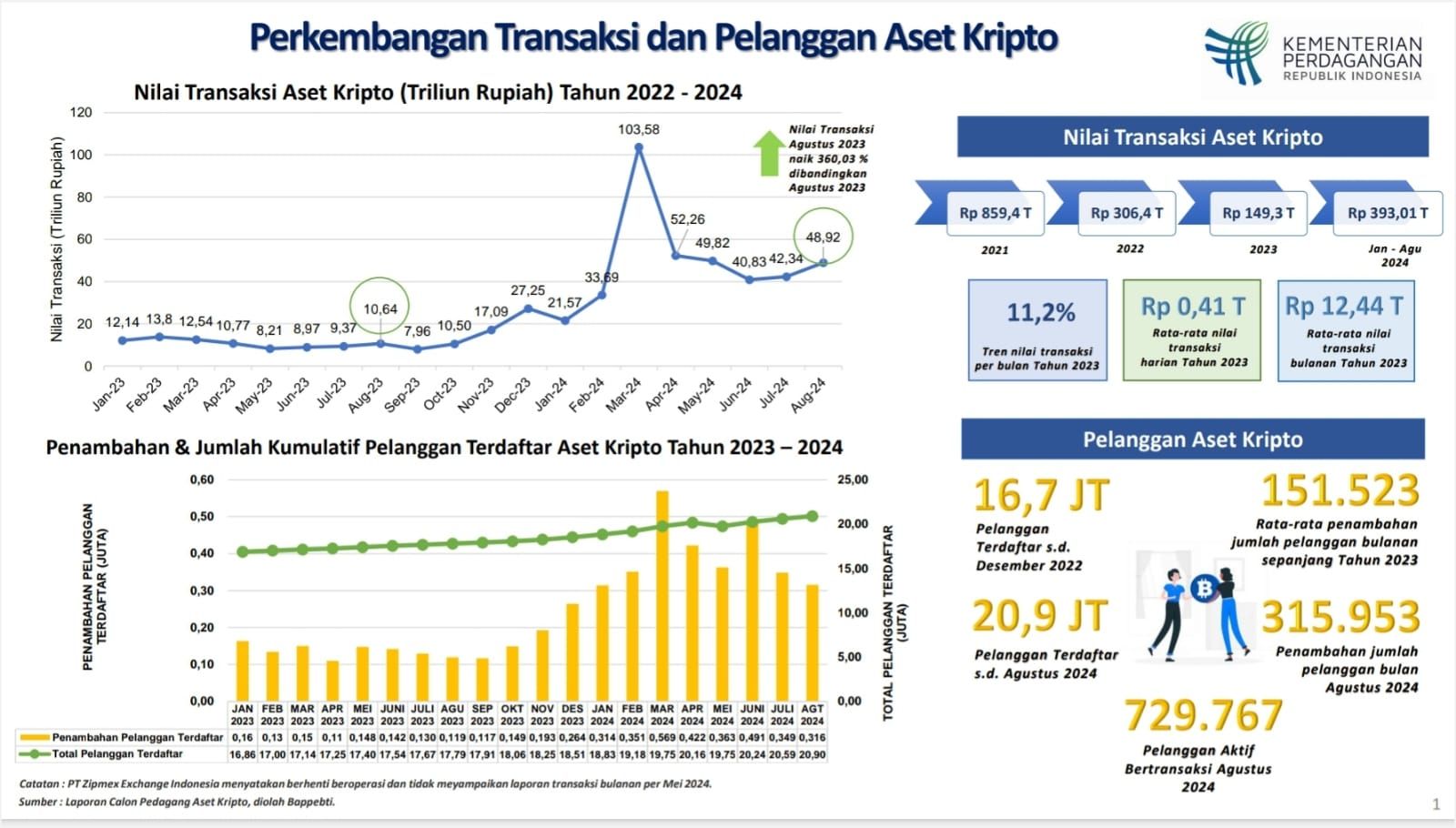 Jumlah itu mengalami peningkatan 15,54% dari bulan sebelumnya yang sebesar Rp42,34 triliun. Tetapi jika dilihat secara akumulasi, nilai transaksi kripto sejak Januari hingga bulan ke-8 lalu sudah memperlihatkan pertumbuhan 360,03% secara tahunan.
