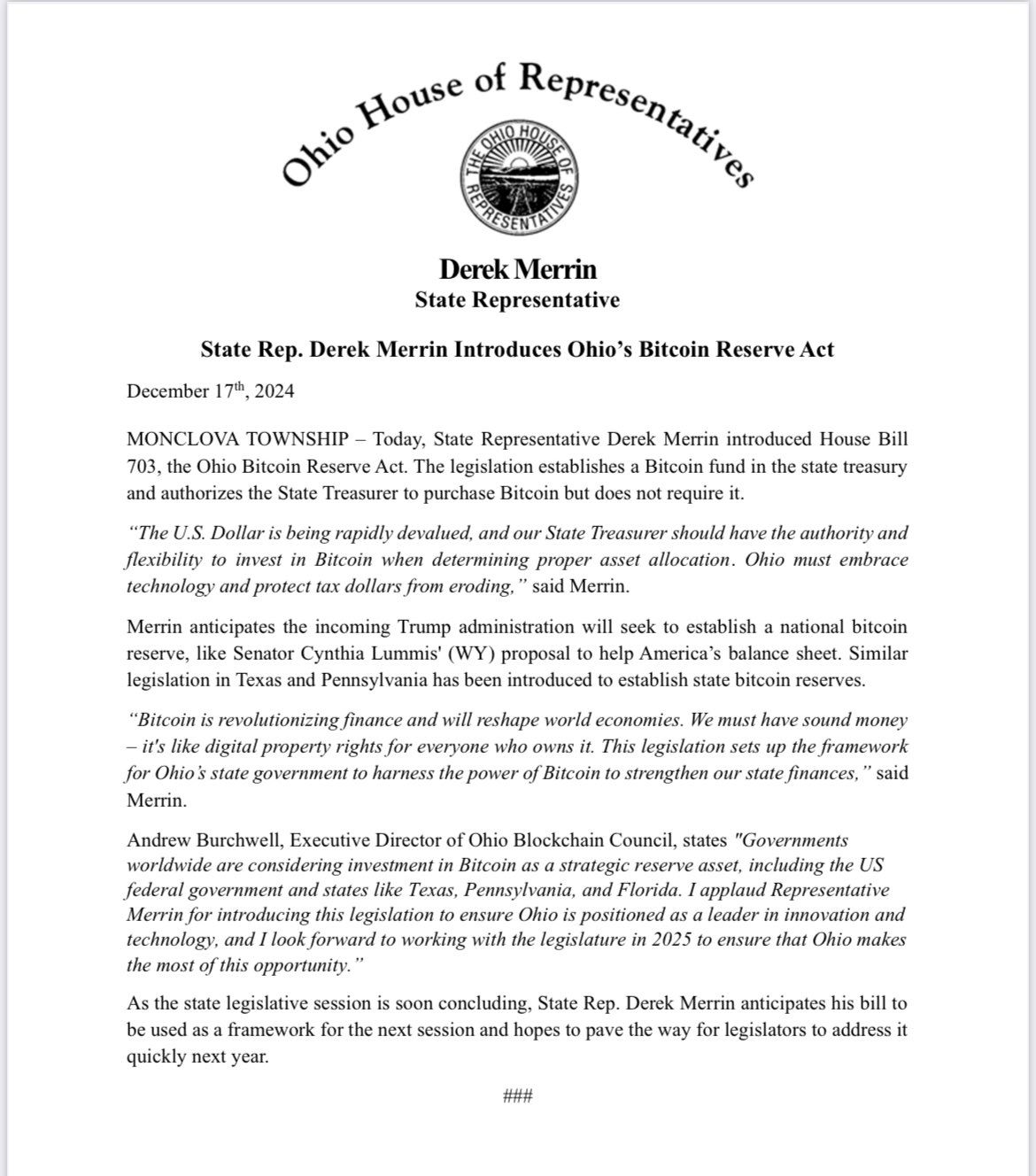 Perwakilan Negara Bagian Ohio, Derek Merrin, telah memperkenalkan House Bill 703, yang bertujuan untuk membentuk cadangan Bitcoin yang didukung negara dalam perbendaharaan Ohio.