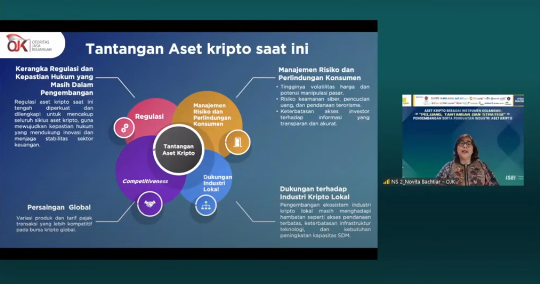 Direktur Pengaturan, Pengembangan, Analisis Informasi Inovasi Teknologi Sektor Keuangan, Aset Keuangan Digital dan Aset Kripto OJK, Novita Bachtiar dalam Webinar Nasional oleh Ikatan Sarjana Ekonomi Indonesia (ISEI) Jakarta menjelaskan, saat ini terdapat beberapa tantangan dalam industri aset kripto Indonesia.