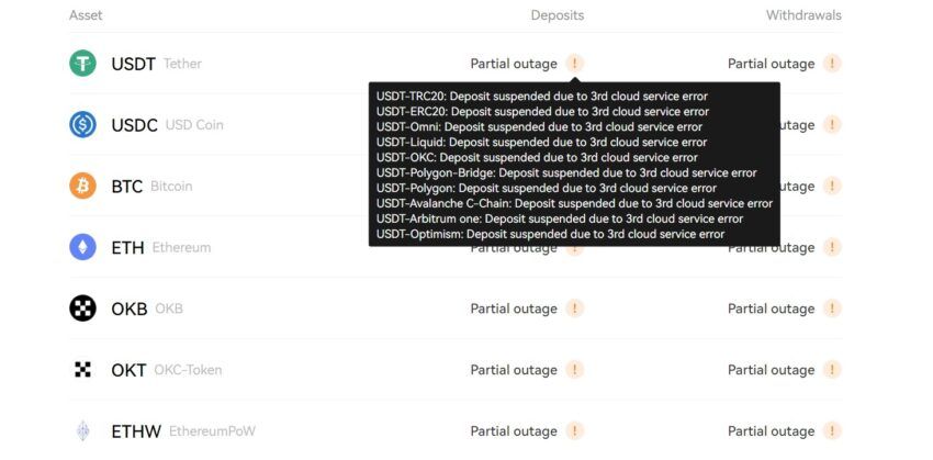 Pada saat publikasi, halaman status OKX menunjukkan bahwa bursa tersebut sedang tidak memproses deposit atau penarikan apa pun pada platform miliknya. Menurut bursa tersebut, layanan ini ditangguhkan karena “kesalahan layanan cloud [pihak] ke-3.”