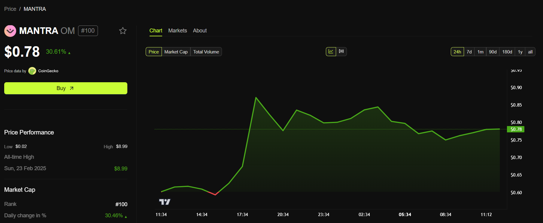 Sementara itu, token kripto OM nampaknya sedang pulih setelah keruntuhan tersebut. Data BeInCrypto menunjukkan bahwa altcoin ini melonjak 30% dalam 24 jam terakhir. Pada waktu publikasi, OM diperdagangkan pada harga US$0,78.