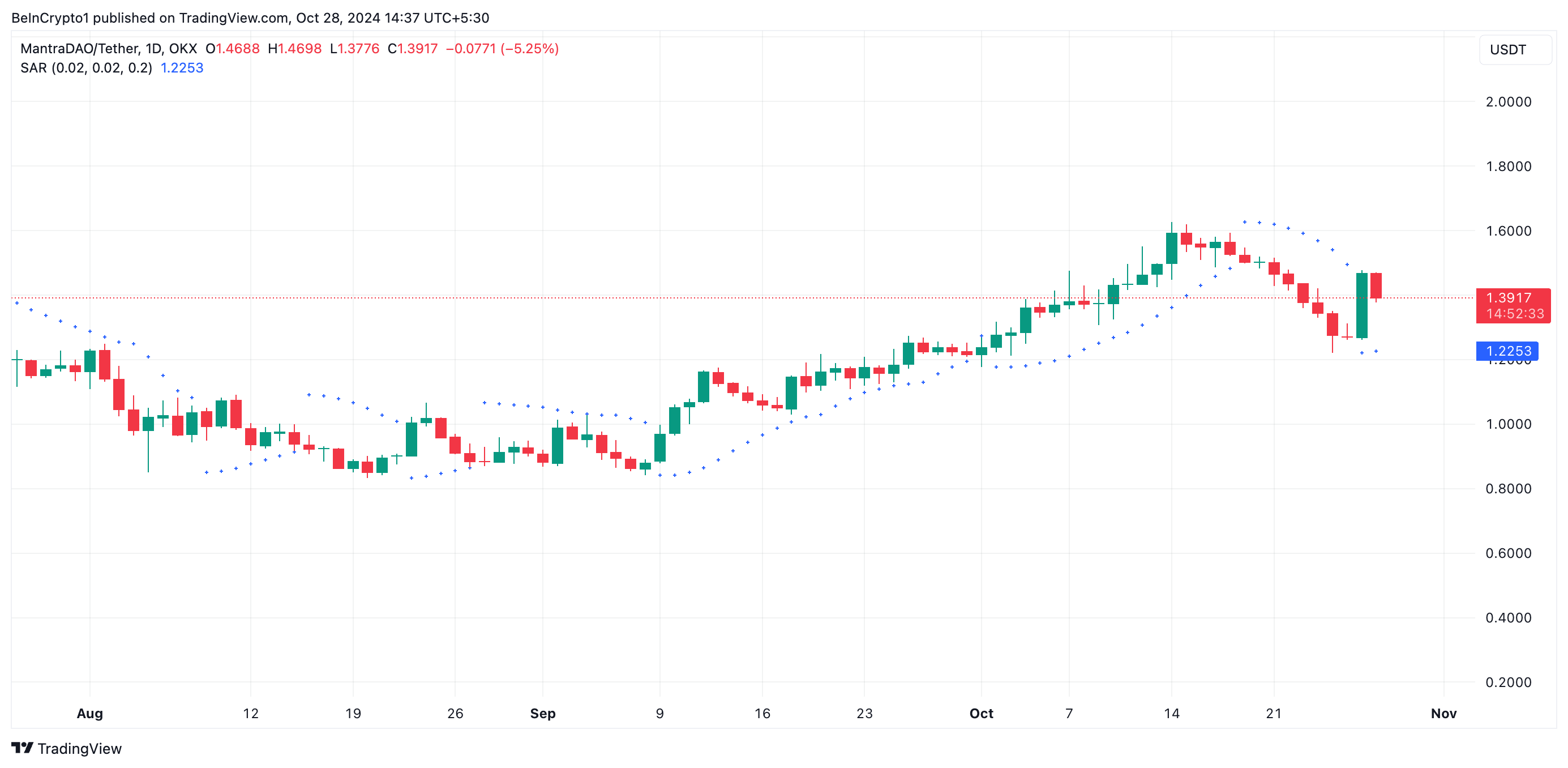 Lebih lanjut, indikator Parabolic Stop and Reverse (SAR) koin ini mengonfirmasi pandangan bullish ini dan kemungkinan reli menuju harga tertinggi sepanjang masa. Penilaian BeInCrypto terhadap grafik satu hari OM/USD menunjukkan bahwa titik-titik dari indikator ini berada di bawah harga OM untuk pertama kalinya dalam delapan hari.