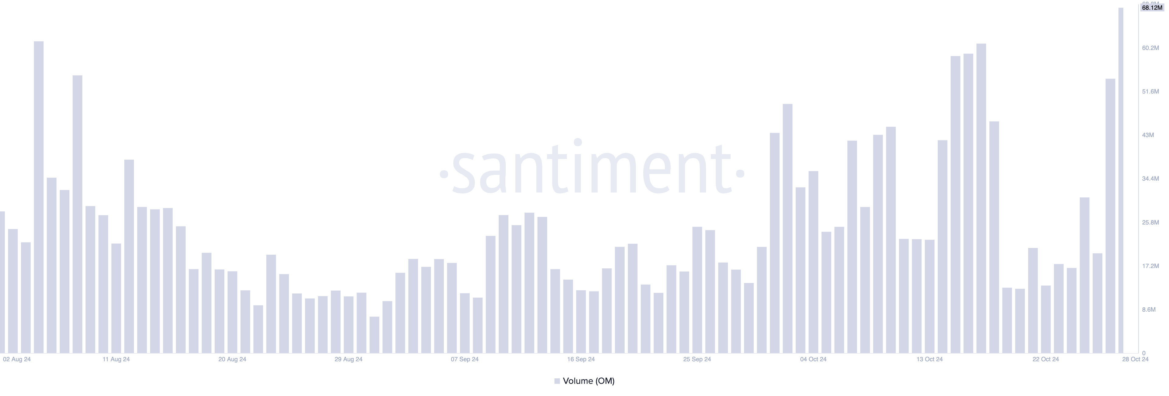 Selain tindakan whale ini, reli harga OM juga didorong oleh lonjakan permintaan pasar umum, seperti yang terlihat dari volume perdagangannya yang melonjak. Dalam 24 jam terakhir, ini telah mencapai total US$68 juta, naik lebih dari 300%. Menurut data dari Santiment, volume perdagangan harian OM saat ini berada pada titik tertinggi sejak Juli.